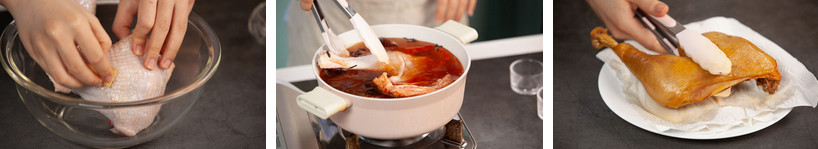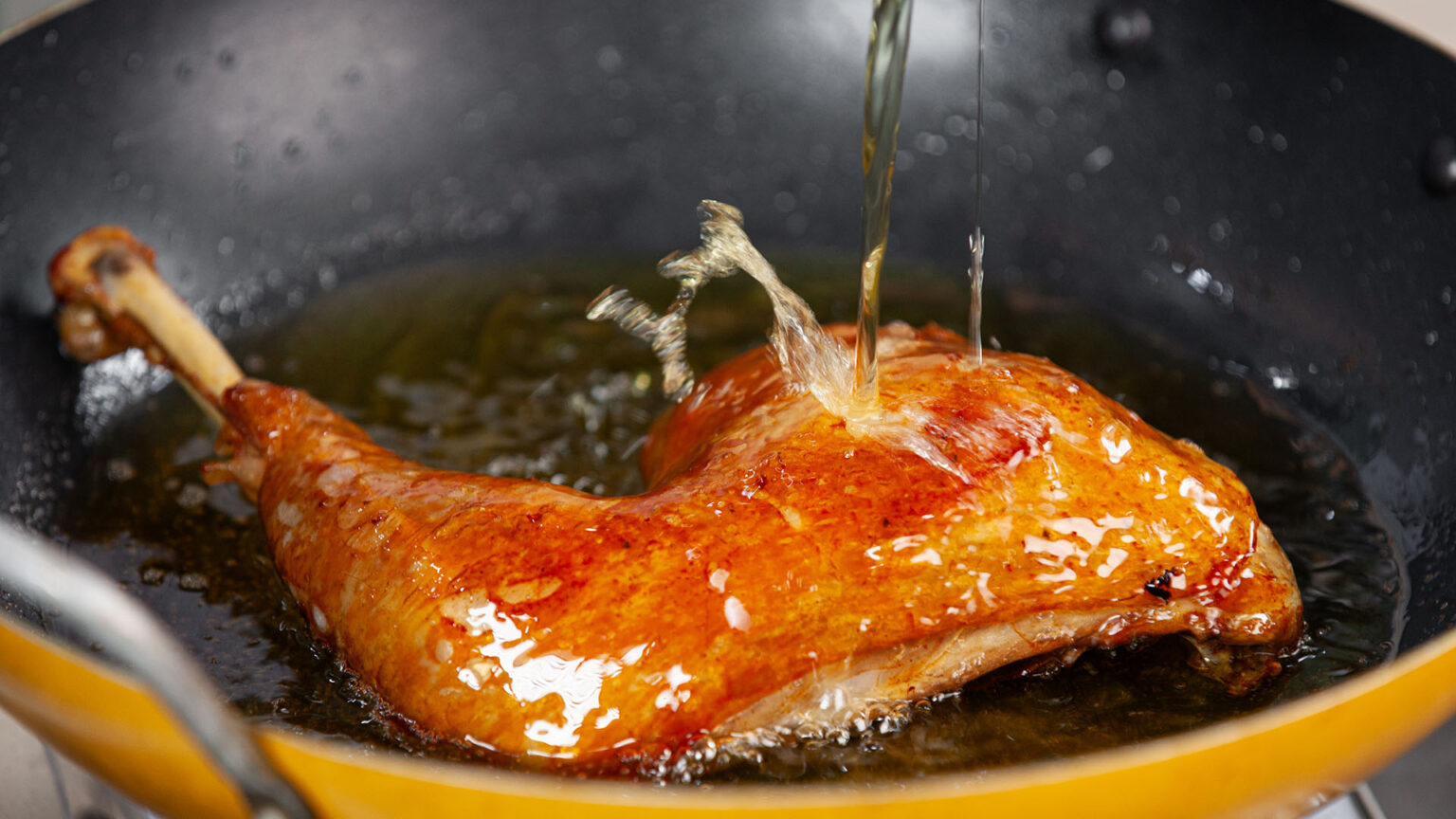 Hương vị này đặc trưng là bởi vì lớp da gà trước khi chế biến đã được chà xát với rượu và gừng đập dập. Hỗn hợp này được rây lọc kỹ càng nhiều lần cho hết xác để đảm bảo thịt gà thấm thật đều.Trước khi chiên, gà đã được luộc sơ với các gia vị đặt trưng và để ráo nước.