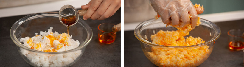 Cơm nấu chin để nguôi, rồi trộn đều với hạt nêm, bột ngọt, dầu màu điều và nước mắm (có thể hoà chút bột gạch tôm với nước rồi trộn với cơm để tăng thêm màu đỏ). Sau đó cho cơm vào vào đảo đều trên lửa vừa, đến khi cơm tơi, để cơm không bị khô cứng, trong lúc chế biến có thể chêm thêm nước luộc gà.