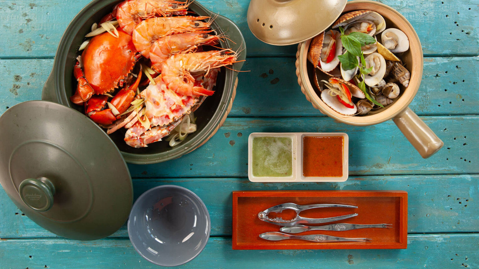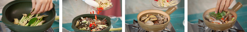 Cho phần sả đập dập, gừng thái lát, ít lá chanh lót dưới đáy nồi. Cho tôm, cua, ghẹ vào, thêm ớt và sả thái lát lên trên mặt, thêm 200ml nước. Đậy nắp và hấp trong 20 phút. Với nghêu, sò, ốc hương hấp tương tự nhưng nên hấp nồi riêng.Khi nghêu sò mở bung miệng thì thêm ít lá húng quế.