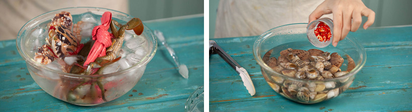 Sơ chế cua: thả cua vào thau nước đá để gây mê, ngâm trong 10 phút; Cọ sạch bùn đất trên mai và mình cua; Nghêu, sò, ốc rửa sạch, ngâm cùng vài lát ớt trong 2 – 3 tiếng cho sạch bùn đất.