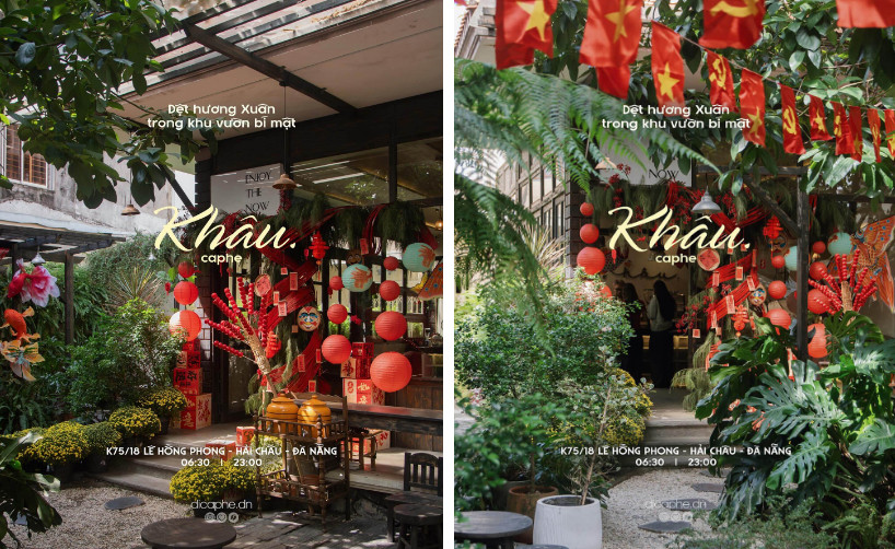 Dệt hương Xuân trong khu vườn bí mật núp hẻm. Khu vườn quen nằm ẩn mình giữa lòng phố đã khoác lên những trang trí mới lạ, đậm màu sắc Xuân. Các concept Tết ở KHÂU. CÀ PHÊ mang tính sáng tạo, độc đáo, được đặt để hòa hợp với tinh thần chung. Khâu có khoảng vườn rộng rãi, ngập tràn màu xanh cây lá. Không gian gần gũi, thân thiện; nội thất mang tông màu vintage nhẹ nhàng. Vườn phục vụ đa dạng các dòng thức uống và bánh ngọt hấp dẫn. KHÂU. CÀ PHÊ sẽ hoạt động xuyên Tết, cùng Khâu lưu giữ những khoảnh khắc thật đẹp này nha.