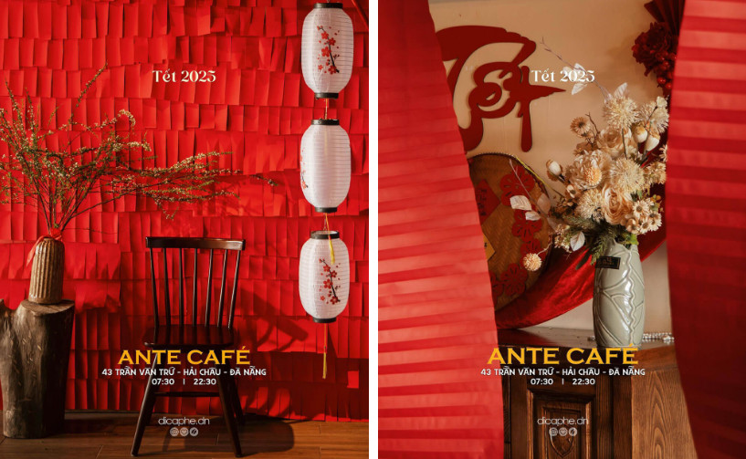 Tết ấm êm cùng ANTÉ CAFE – tọa độ cafe mở xuyên Tết, không phụ thu. Hương vị mùa Xuân đã phủ đầy trong không gian ấm áp của ANTÉ CAFE. Những góc Tết nhẹ nhàng mang sắc đỏ tươi mới, rộn ràng. Tiệm có ba tầng rộng rãi, thiết kế theo hơi hướng cổ điển, đem lại cảm giác thư giãn bình yên. Nằm ngay TTTP và có cả view sông Hàn, cầu Rồng – đây là toạ độ lý tưởng để gặp gỡ. Bên cạnh đó không gian còn phù hợp với đa dạng nhu cầuđi cà phê. ANTÉ CAFE phục vụ nhiều dòng thức uống, có bánh ngọt thơm ngon. Đồ uống được tập trung chất lượng, đặc biệt sử dụng dòng matcha Nhật cao cấp,…
