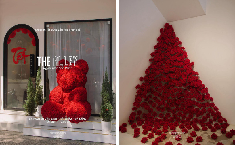 Tọa độ ngập tràn hương sắc Xuân cùng em Gấu Hoa khổng lồ. Nằm trên con đường nhộn nhịp giữa TTTP, THE ALLEY mang dáng vẻ khiêm tốn nhưng ẩn bên trong là vô vàn góc check-in Tết thú vị. Nổi bật ngay lối vào là em Gấu to lớn được đính bằng hằng trăm đóa hồng đỏ rực rỡ, không gian hai tầng phủ kín các trang trí tươi mới, đậm sắc Tết. Các concept đa dạng được thực hiện tỉ mỉ, phù hợp cho nhiều phong cách khác nhau. Ánh sáng đủ, thích hợp cho cả ban ngày lẫn đêm. Quán còn chuẩn bị sẵn phụ kiện như dù, quạt để bạn có thể sử dụng. Đặc biệt THE ALLEY sẽ mở cửa xuyên Tết, không phụ th.u. Ghé quán đón không khí xuân về nha.