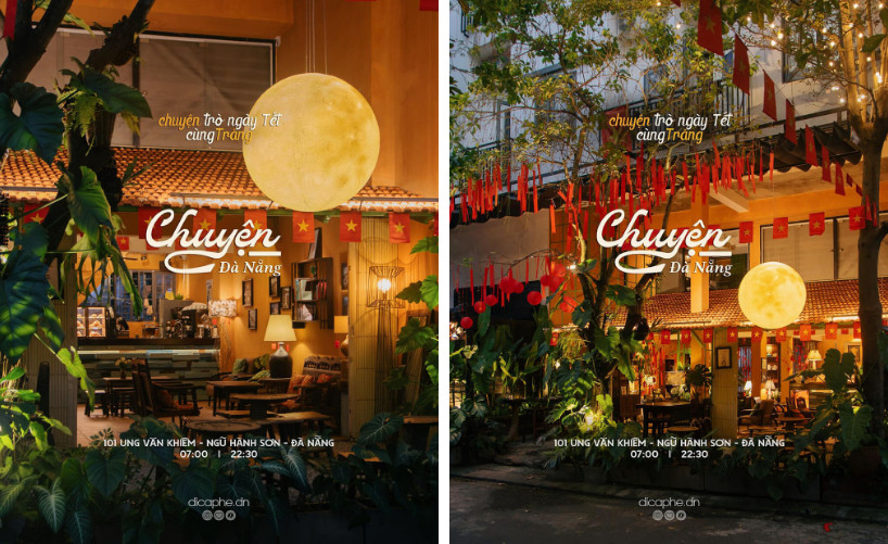 CHUYỆN – ĐÀ NẴNG trò ngày Tết cùng Trăng. CHUYỆN – ĐÀ NẴNG nép mình ở một góc phố bình lặng, dưới hàng cây cao lớn, mang nét Việt giản đơn và ấm áp. Gian nhà mái ngói của quán đã ngập tràn không khí Xuân, trang trí đơn giản mà hợp vibes, với đầy sắc đỏ may mắn. Quán phục vụ khá đa dạng từ nước đến bánh, các sản phẩm chú trọng vào chất lượng. Tiệm còn thường xuyên cho ra mắt các món mới theo mùa. Ấn tượng nhất có lẽ là Cà Phê Sữa Mè Đen – thơm béo đậm đà. Quán sẽ hoạt động xuyên Tết, cùng ghé gian nhà nhỏ trò chuyện đón Xuân về nha.