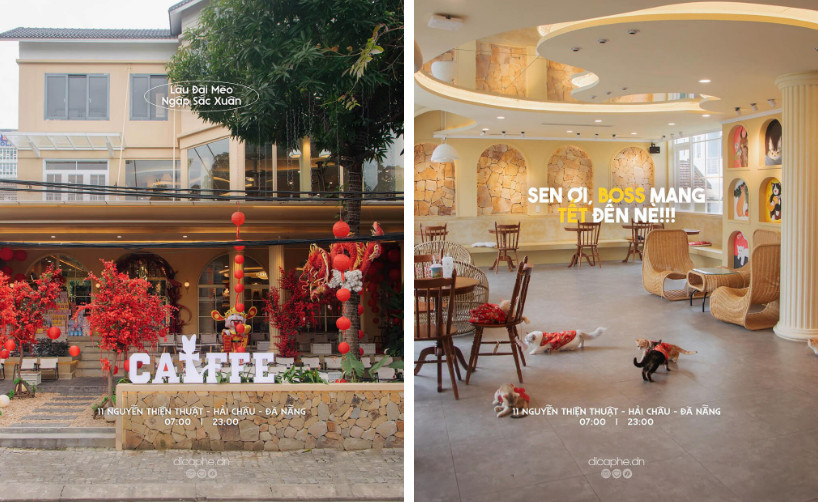 Không khí Tết đã về với CATFFE – nơi trú ẩn yên bình cho các “Boss” nằm ngay giữa TTTP. Khoảng sân rộng rãi được phủ kín bởi sắc đỏ may mắn, các góc check-in Tết được đầu tư chỉn chu, không gian lung linh nổi bật cả một con phố. Các bé mèo được lên đồ siêu xinh, đầy màu sắc tươi mới.CATFFE sẽ mở cửa phục vụ xuyên Tết, du Xuân đi cà phê mèo – ngắm mèo nhé.