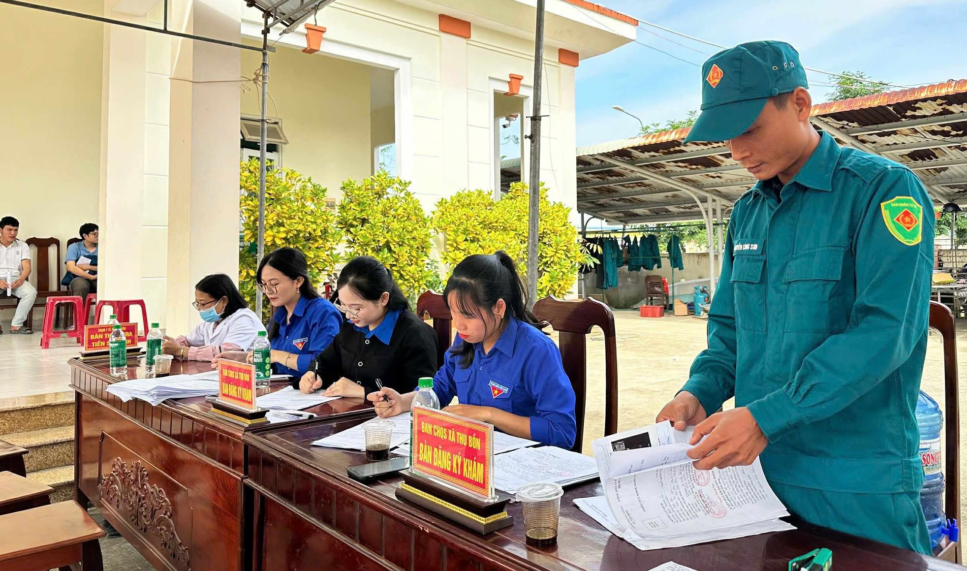 Đoàn viên thanh niên và Dân quân xã phối hợp hỗ trợ ghi Phiếu khám sức khỏe
