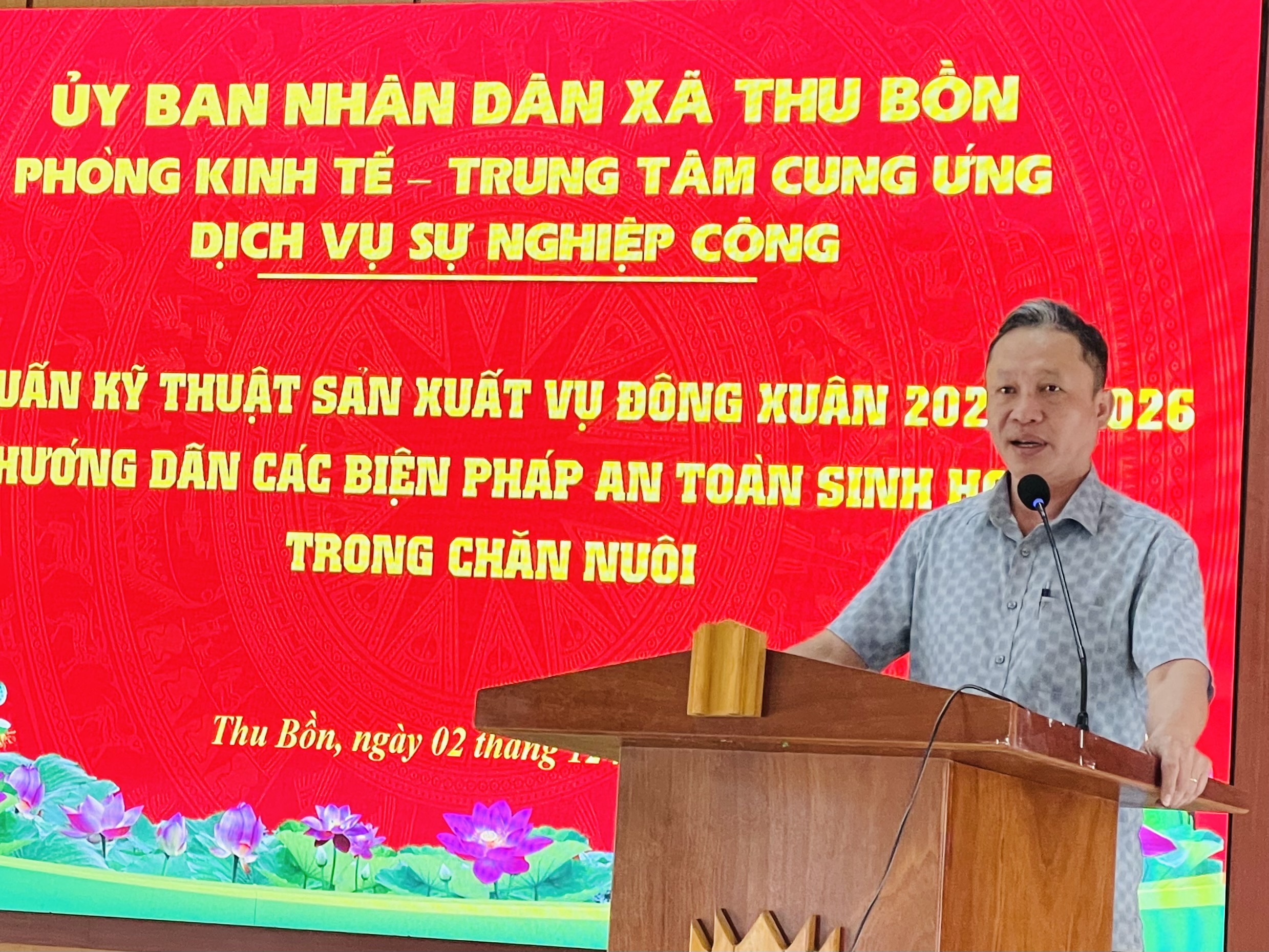 Ngày 2/12, Phòng Kinh tế xã Thu Bồn phối hợp với Trung tâm Cung ứng dịch vụ sự nghiệp công xã tổ chức tập huấn kỹ thuật sản xuất vụ Đông Xuân 2025-2026, hướng dẫn các biện pháp an toàn sinh học trong chăn nuôi cho trưởng thôn, cán bộ khuyến nông, thú y và hợp tác xã thuộc 25 thôn trên địa bàn xã.